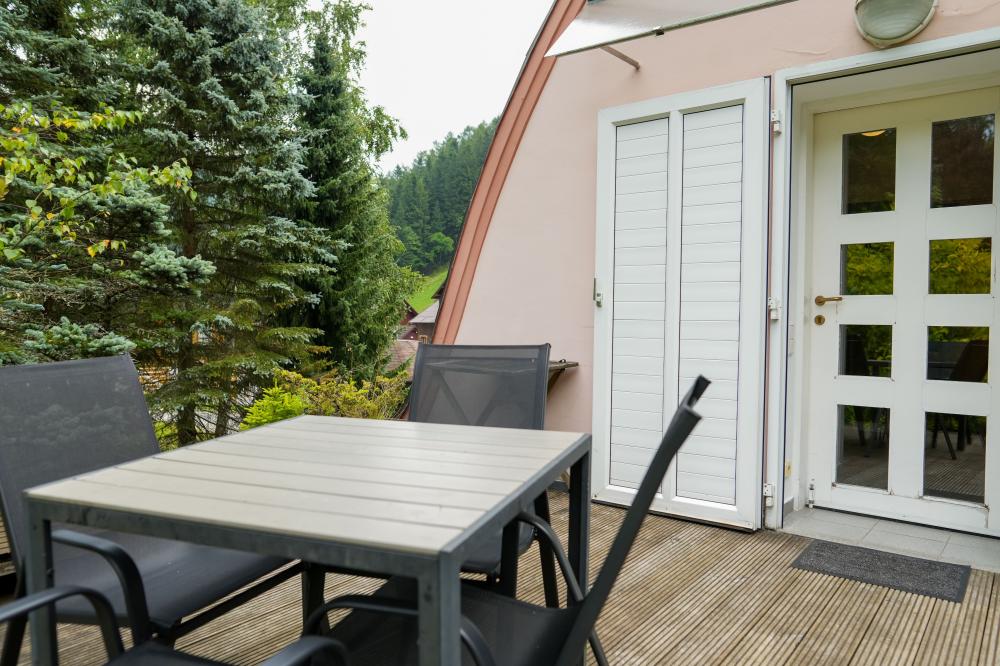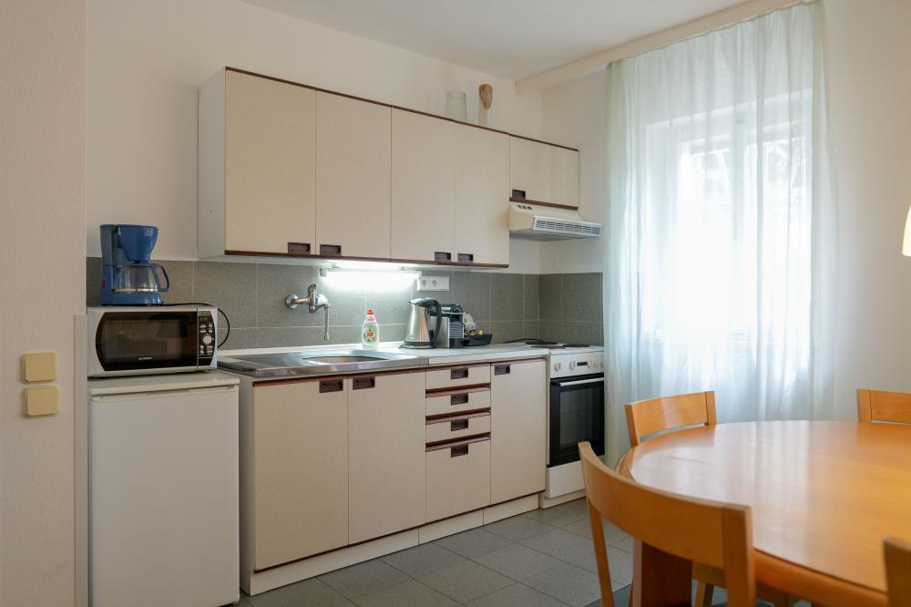 terasa, TV - satelitní programy, topení, zvuková izolace, dlážděná podlaha/koberce, skříň/šatna, věšák na oblečení, pohovka, kuchyňský kout, lednička, kombinovaný sporák, jídelna, rychlovarná konvice, kuchyňské potřeby, toustovač, kávovar, koupelna se sprchou, toaleta, venkovní nábytek, ručníky, povlečení, toaletní papír.